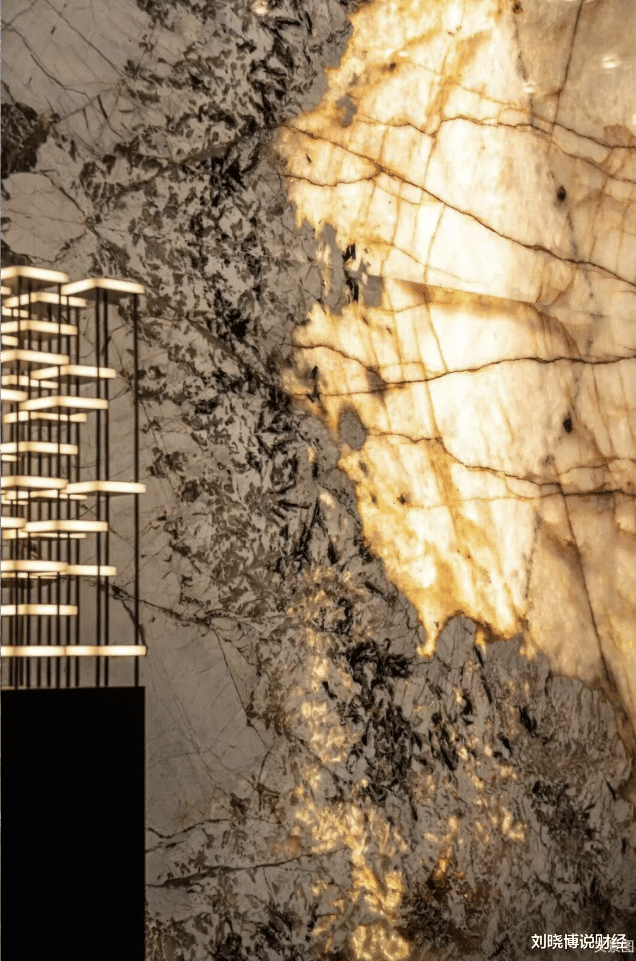 美盛不计成本地搜罗全球珍稀石材:从文体中心地面铺设的巴西海浪石,到墙面铺砌的整幅百万级伊朗青玉,再到园林中意大利雪山飞狐、普拉达绿等奢石与罗汉松、铁冬青等名贵植被交相辉映,每一寸都散发着金钱与艺术的味道。(下为实景图)